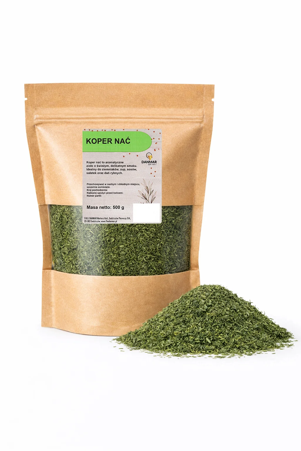 Koper nać suszony o świeżym aromacie. Idealny do ziemniaków, zup, sosów i sałatek. Naturalny smak w wygodnej formie.