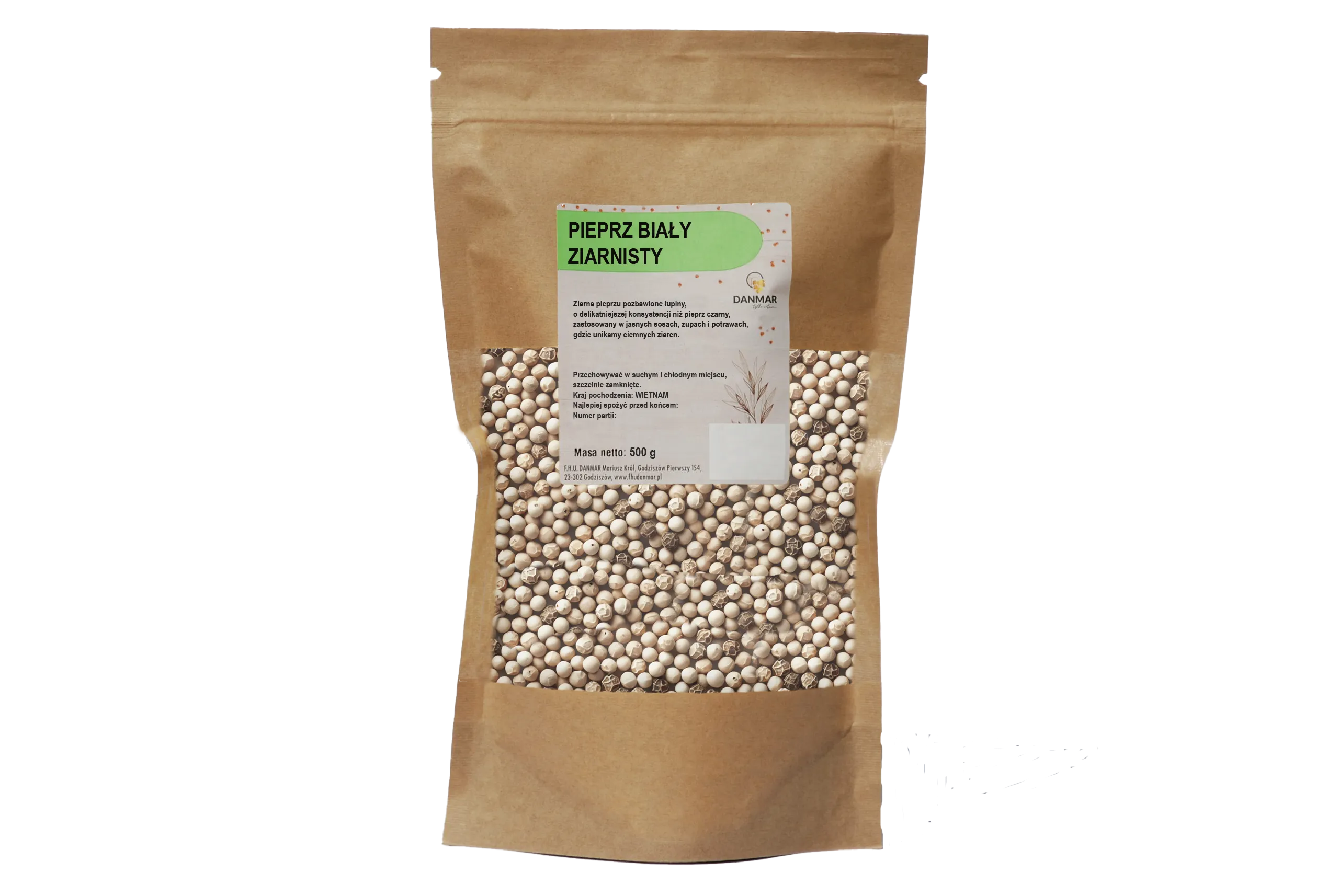 Dzięki opakowaniu typu doypack, nasz pieprz biały ziarnisty zachowuje świeżość i intensywność smaku na długo. Możesz przechowywać go w oryginalnym opakowaniu bez obaw o pogorszenie jego walorów smakowych. Wystarczy zamknąć strunowe zamknięcie po użyciu i przechowywać przyprawę w suchym miejscu, z dala od bezpośredniego światła słonecznego. Opakowanie doypack chroni pieprz biały przed wilgocią, co pozwala mu pozostać świeżym i aromatycznym przez długi czas.